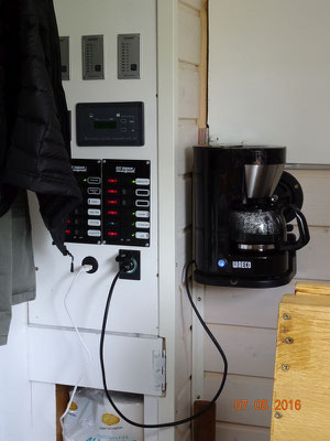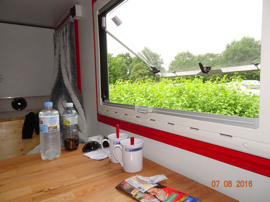 nicht eine Sauna zu erhalten. Der Kühlschrank läuft permanent am Strom (ab Batterie) und kühlt die Milch und das Bier. (mehr haben wir noch nicht, ok zwei Flaschen Wasser hats noch drin). Das